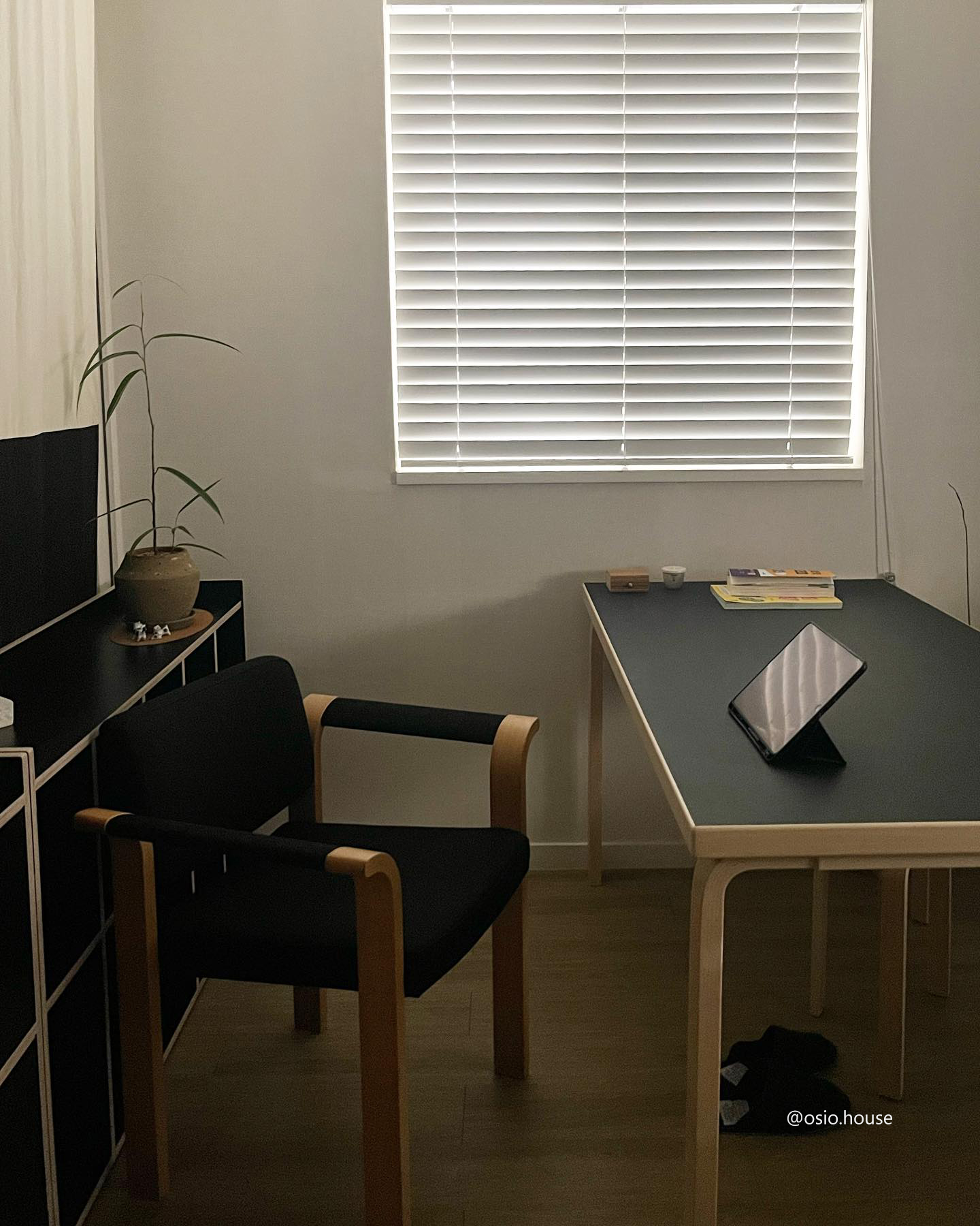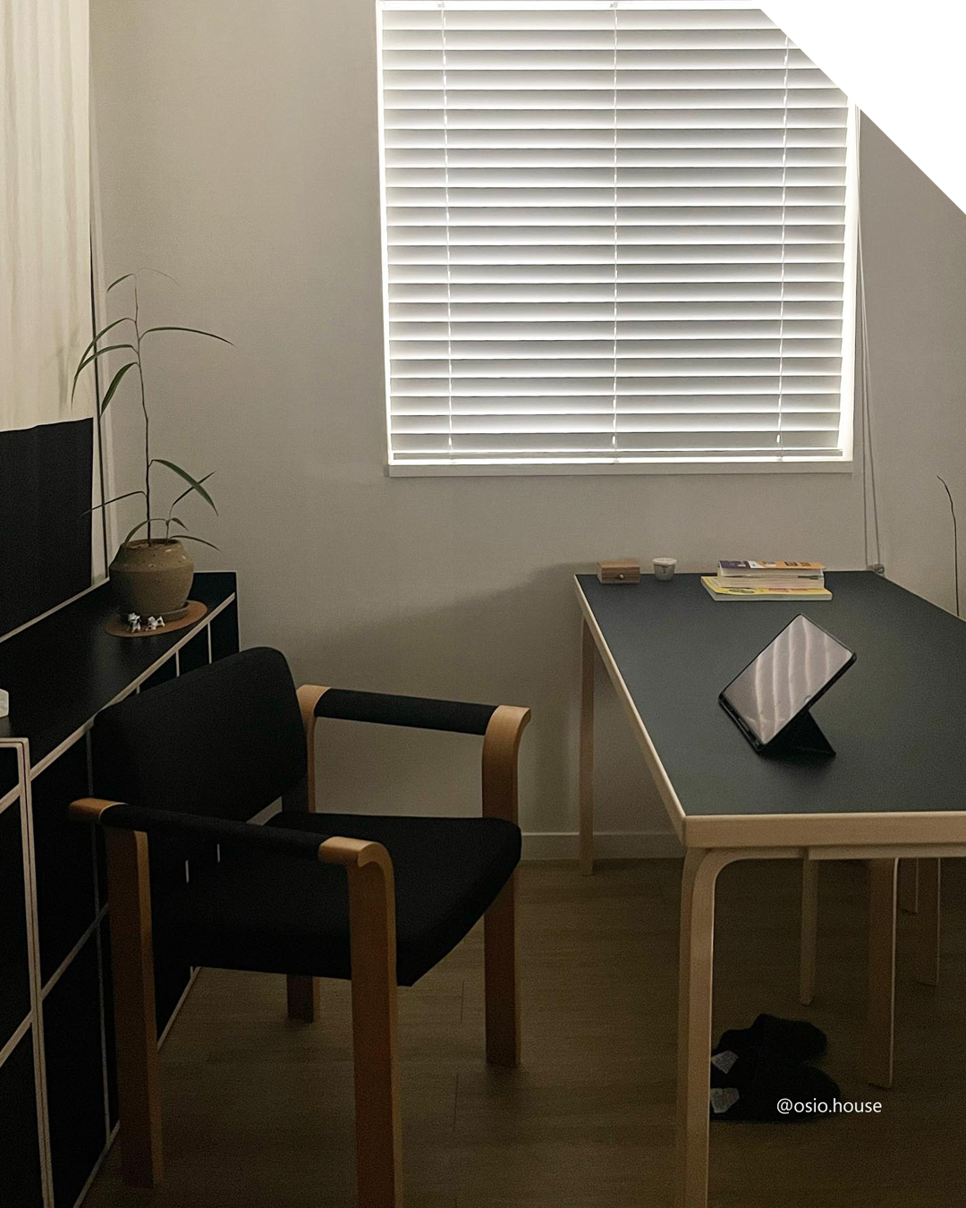 블랙 빈티지 체어와 테이블, 책장이 어우러져 깊이 있는 무드가 완성됐어요.