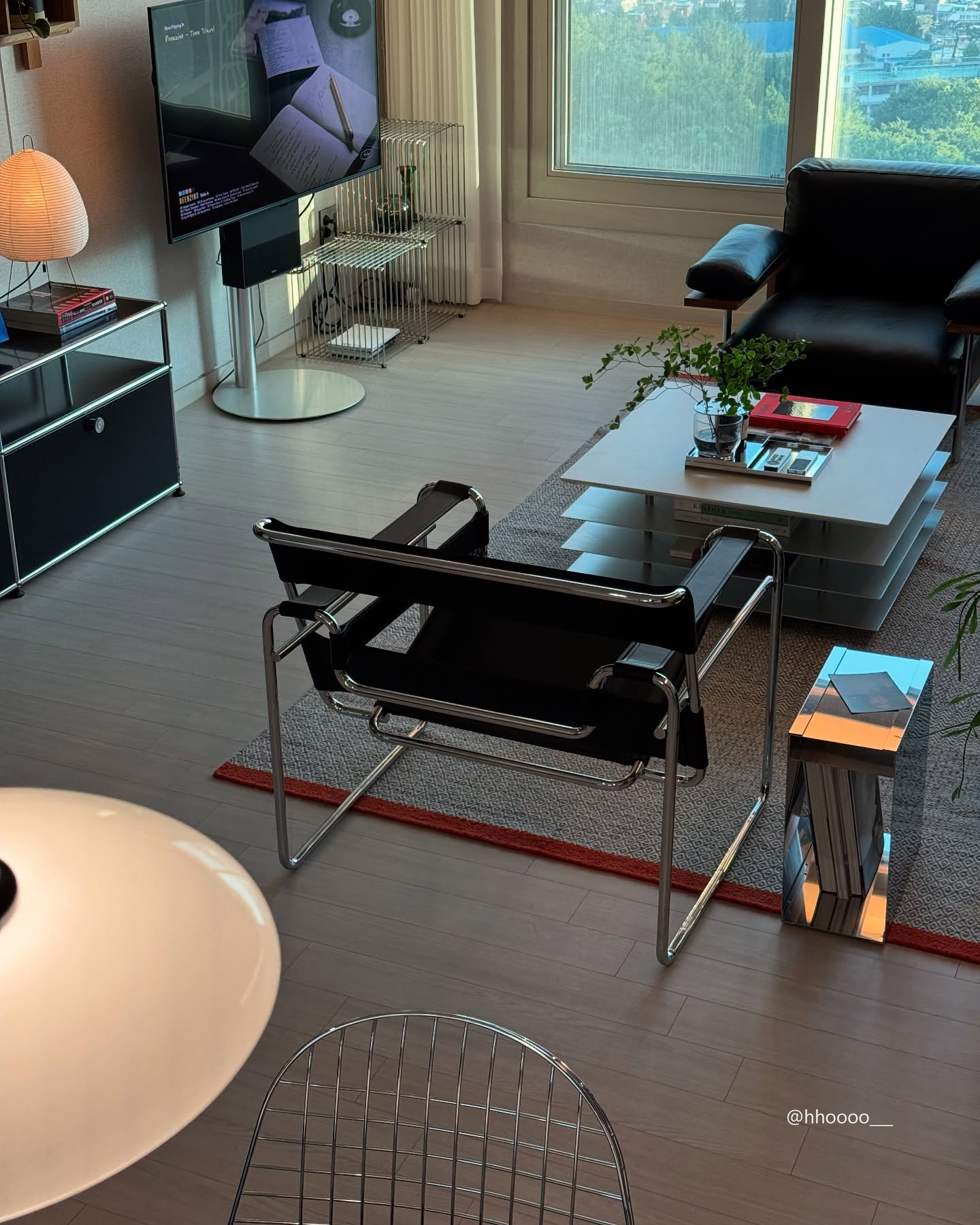 블랙 무드로 채운 거실, 라운지체어에서 여유를 느껴보세요.
