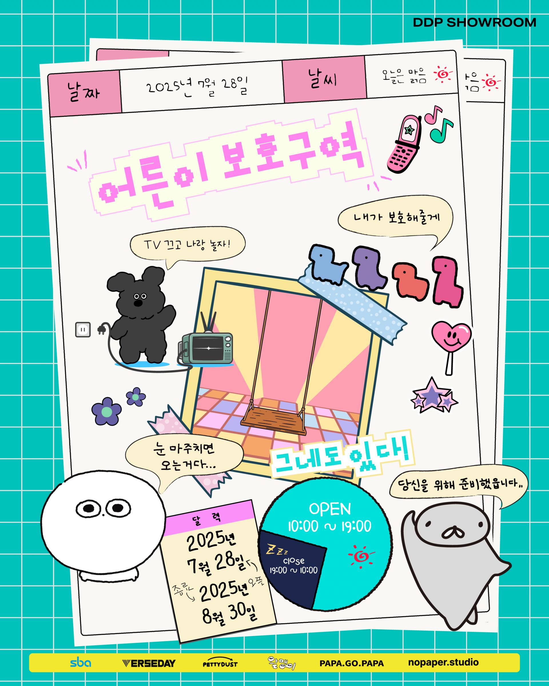 DDP 쇼룸에서 ‘어른이 보호구역’ 팝업이 열렸어요! 그네를 타며 즐기는 미디어 아트 전시부터, 귀여운 캐릭터 체험과 굿즈까지 준비된 힐링 공간이에요. 지친 어른이들을 위한 특별한 쉼터, 전시가 곧 마감되니까 놓치지 마세요!