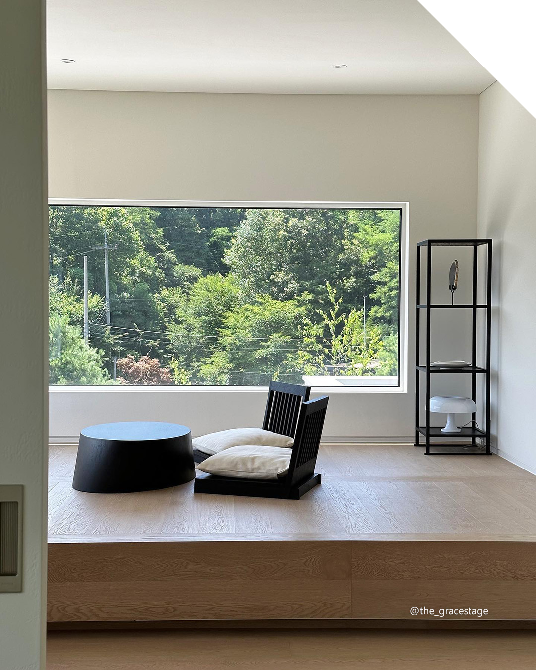 낮은 단과 좌식 테이블, 창밖 초록 풍경까지 공간, 가구, 색감이