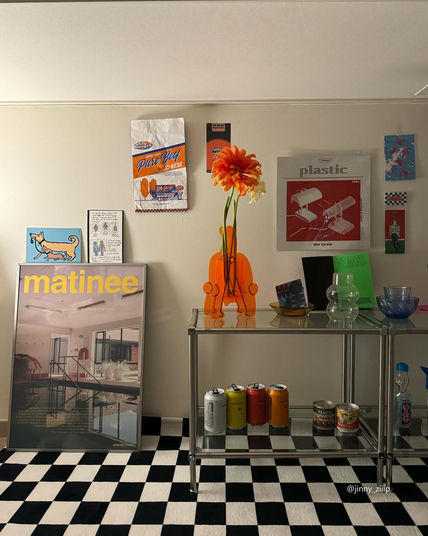컬러풀한 아이템으로 채운 복층 취향 공간.주황색 투명 아크릴 화병, 귀엽지 않나요?고양이 뒷모습을 형상화한 디자인이 포인트예요.