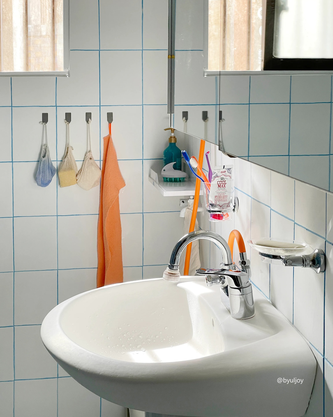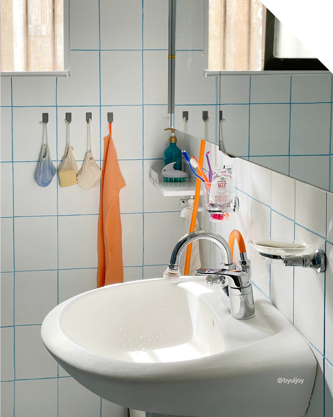 하얀 타일 사이사이에 하늘색 마카로 포인트를 주어 귀엽고 유니크한 욕실을 완성했어요.오렌지 샤워기 호스와 소품들 덕분에 컬러감도 돋보이는 공간이 되었어요🛁🌈