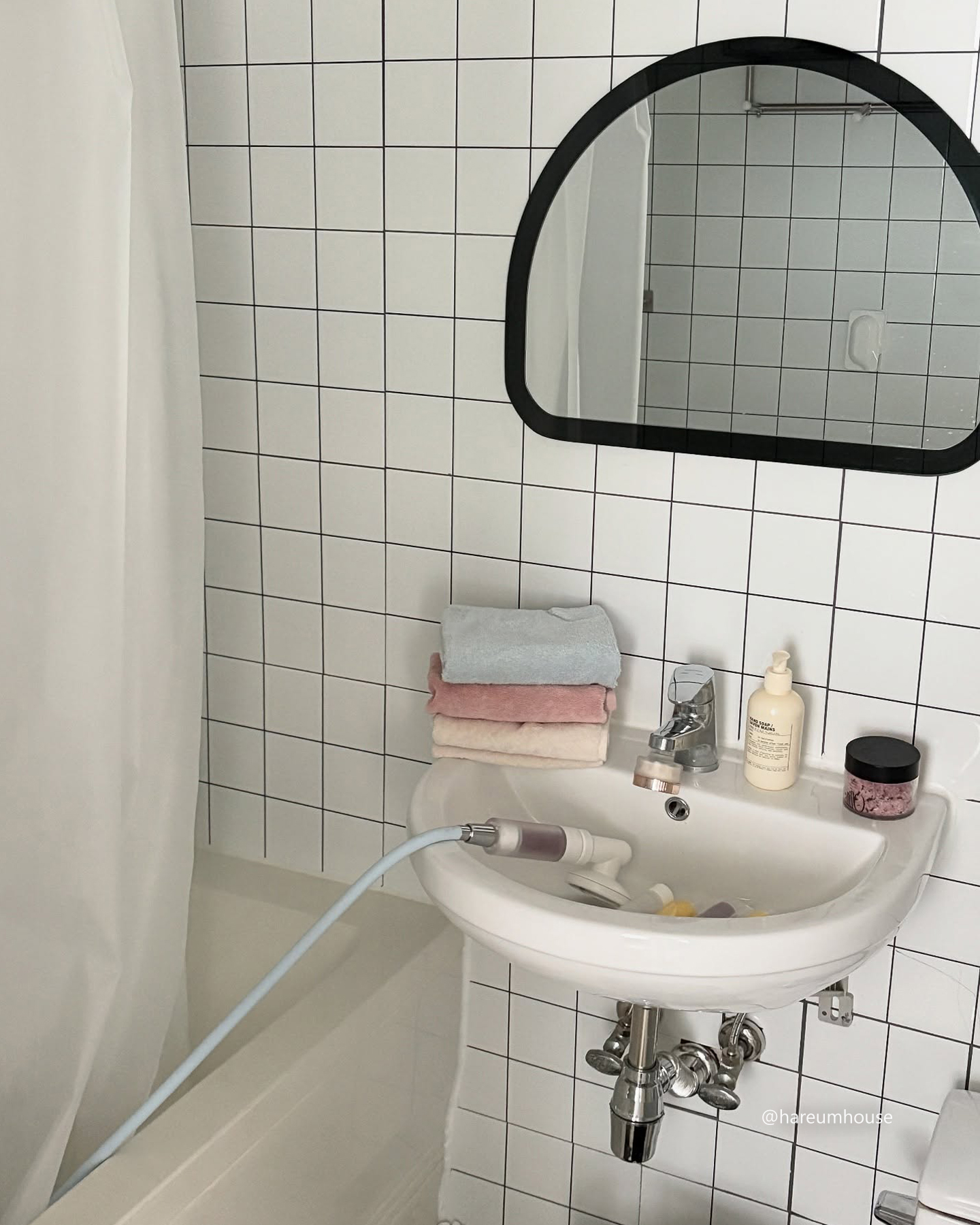 화이트 톤으로 꾸민 셀프 욕실.블랙 반원형 거울이 포인트가 되어 심플하지만 개성 있는 무드를 만들어줘요🤍🖤