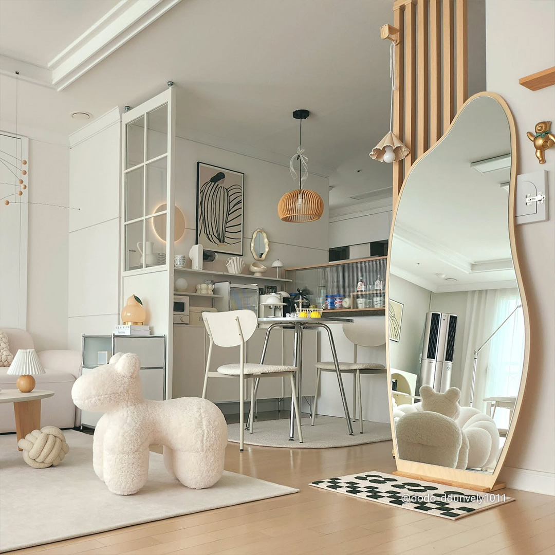비정형의 거울 프레임이자연스럽게 시선을 끌어요.공간을 부드럽게 연결해 주는 거울의 힘.🤍