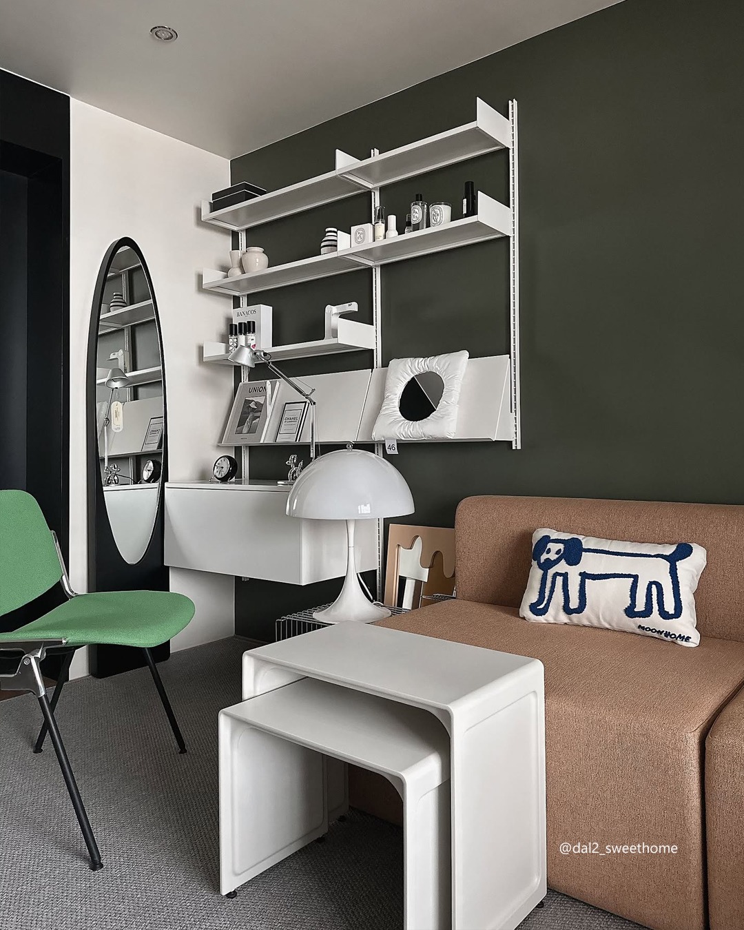 딥그린 벽과 조화를 이루는 시크한 무드에유니크한 프레임의 전신거울로 공간에 멋을 더했어요. 💚