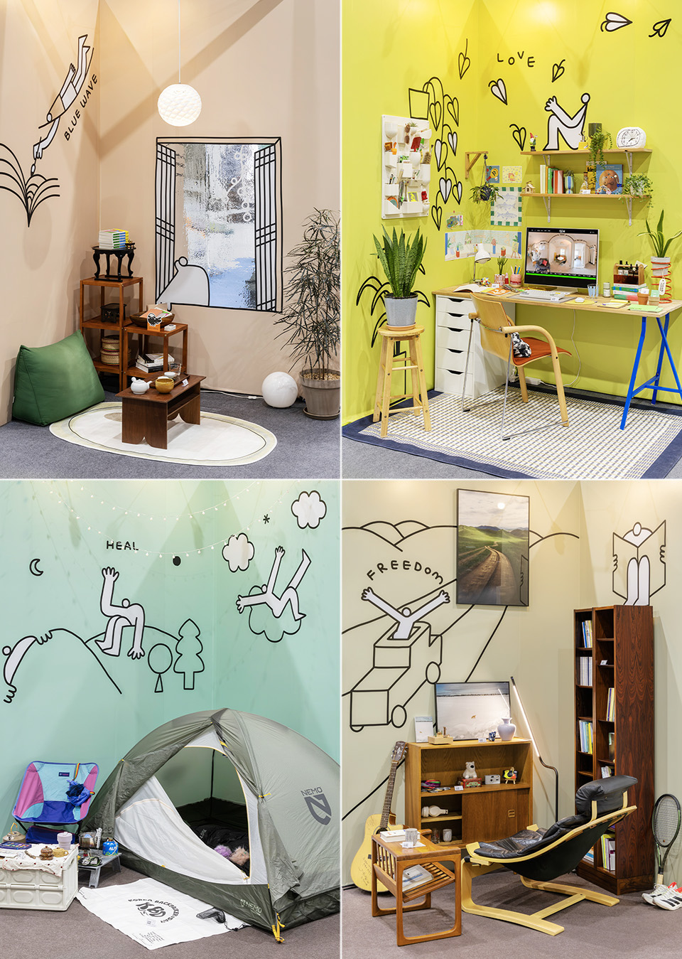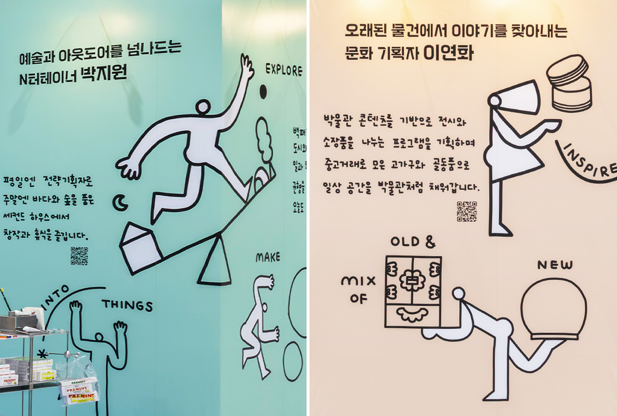 1집러 네 명의 공간을 함축해 보여주는 전시인 만큼 배경에 그려진 일러스트만 봐도 그들의 ‘라이프 스타일’과 ‘스토리’, ‘취향’이 연상되게끔 하는 데 집중했어요. 가능한 그분들의 철학까지 담고 싶었기에 자료 조사에 공을 많이 들였죠. <1집구석>에 소개된 공간은 물론이고, 인터뷰, 저서까지 자료를 모아 여러 번 보았어요. 그 속에서 각자의 라이프 스타일은 무엇인지, 삶을 대하는 태도는 어떠한지에 대한 아이디어를 얻고, 핵심 키워드를 찾아내 그림과 문구로 풀어냈습니다.