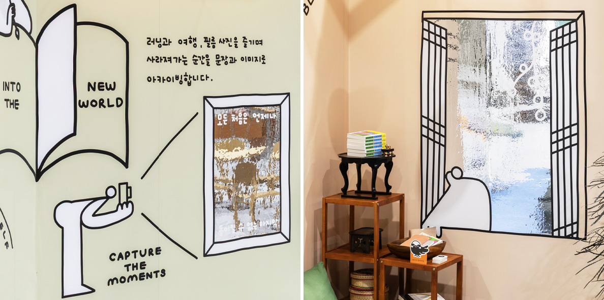예를 들어, 윤두열 님의 공간 외벽에 ‘모든 처음은 언제나 돌이킬 수 없는 마지막’이라는 윤두열 님의 메시지가 적힌 미러 시트지 액자를 더했어요. 그 앞에서 사진을 찍으면 관람객이 마치 윤두열 작가의 사진 속 인물이 된 듯한 경험을 할 수 있도록 했죠. 이연화 님의 공간은 차를 마시는 벽면에 한옥 창문을 모티프로 한 미러 시트지 창을 만들어, 빛과 자연이 반사되며 일러스트와 어우러지게 했습니다. 이 시트지는 완전히 비치는 거울이 아니라, 살짝 흐릿하게 반사되는 소재라 현실보다 더 몽환적이고 부드러운 장면이 만들어졌어요.